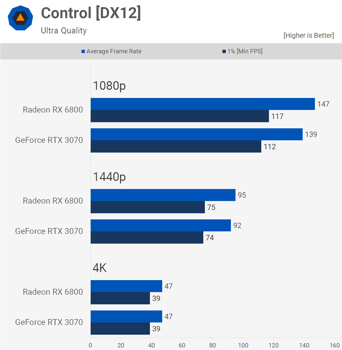 Control is yet another game where these AMD and Nvidia GPUs seem evenly matched, however this title supports DLSS 2.0, so you can easily boost the performance of the RTX 3070, which makes it a no contest.