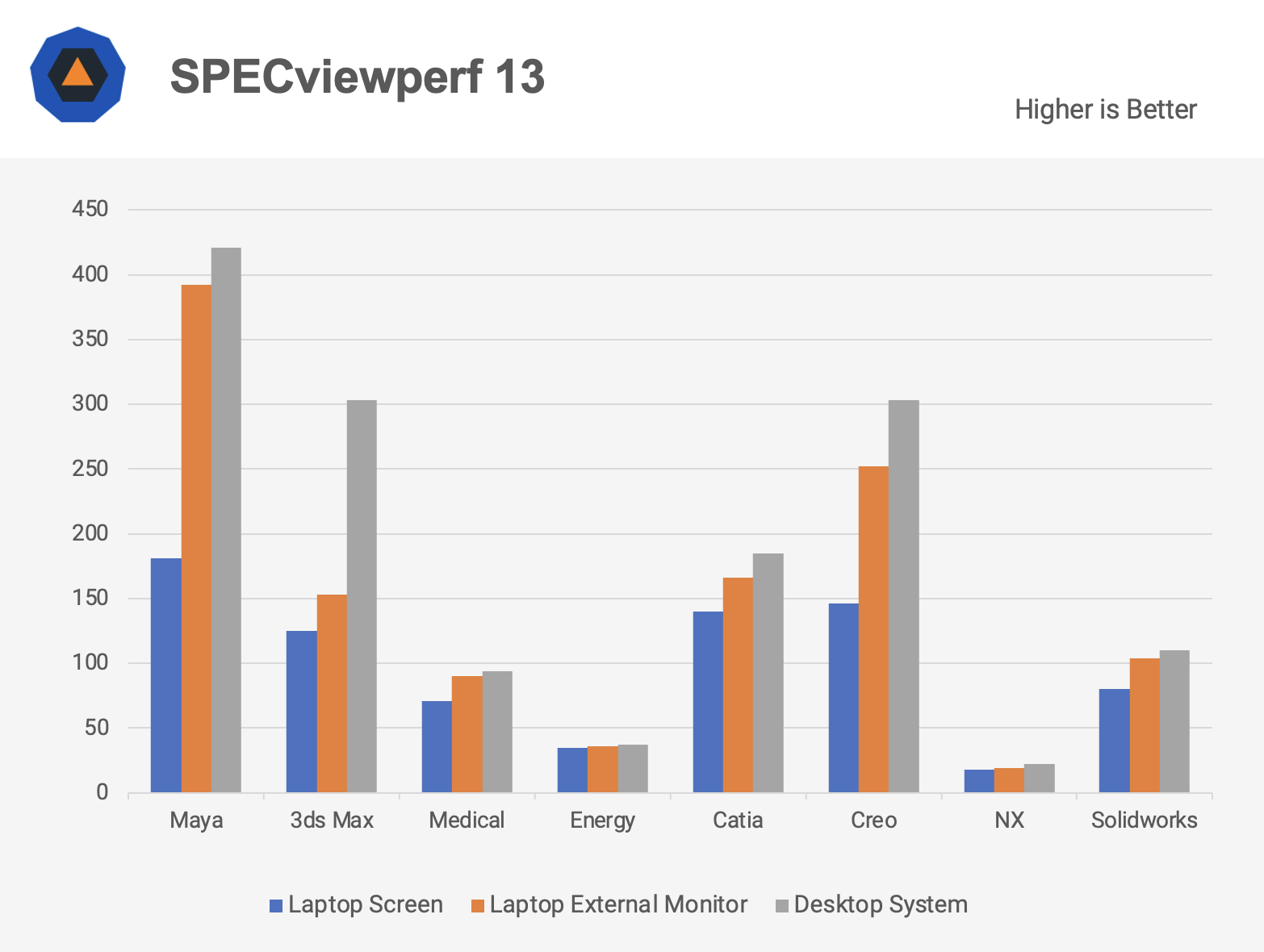 The CAD applications tested give roughly similar results. The performance drop going from an external monitor to the internal screen was much greater than going from desktop performance to an external monitor. Catia on the Core X with an external monitor was 10% slower than on a desktop, Creo was 20% slower, NX was 10% slower, and Solidworks was 5% slower.