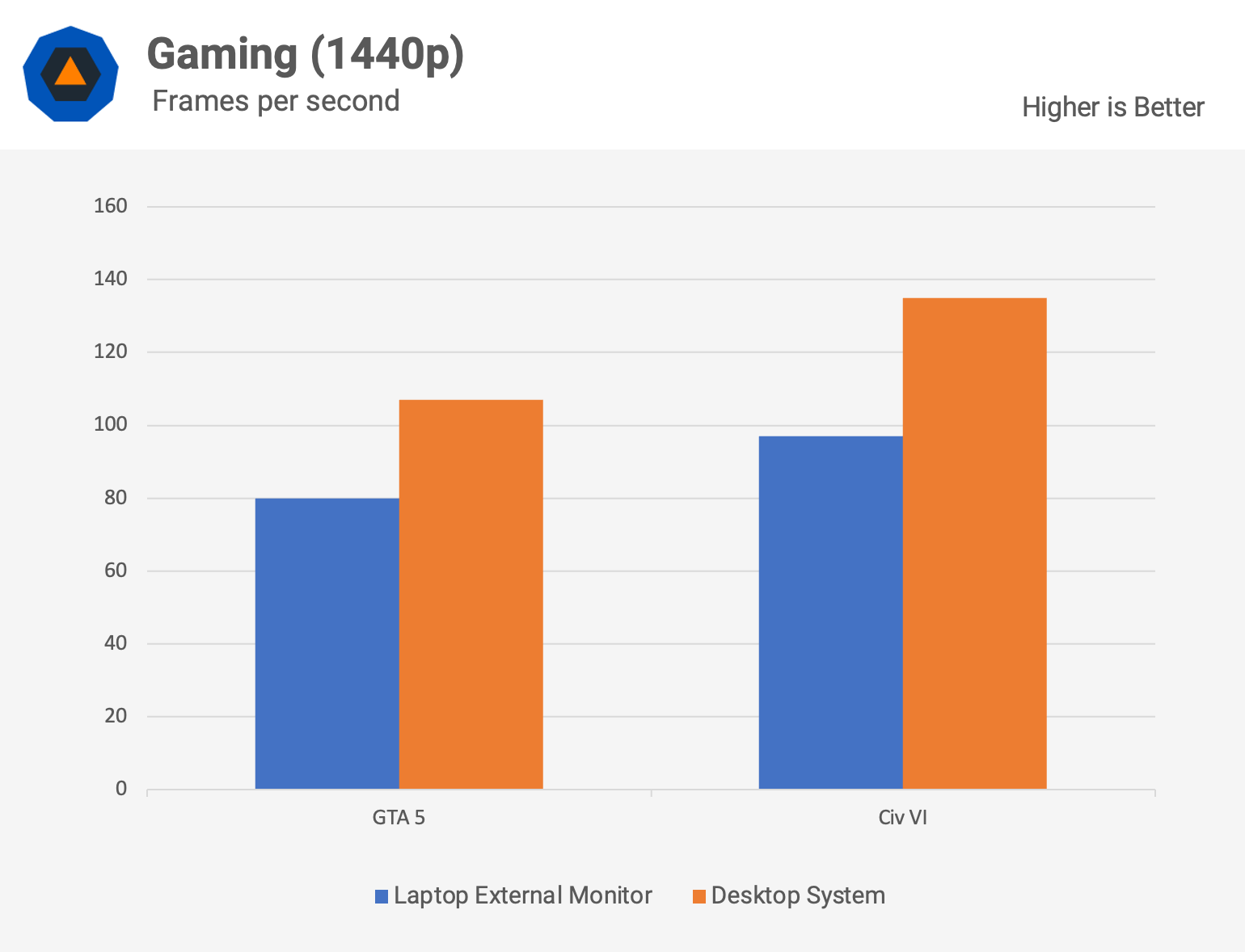 Also interesting to note is that you can expect a 5-10% performance improvement if you use the Core X with an external monitor. This is intuitive since the GPU doesn't have to send the display data back to the laptop for it to process on the built-in screen. All that stuff comes out of the GPU's ports like normal. The results would be the same even if more games were tested. What we're interested in here is how the Core X performs, not the individual GPU.
