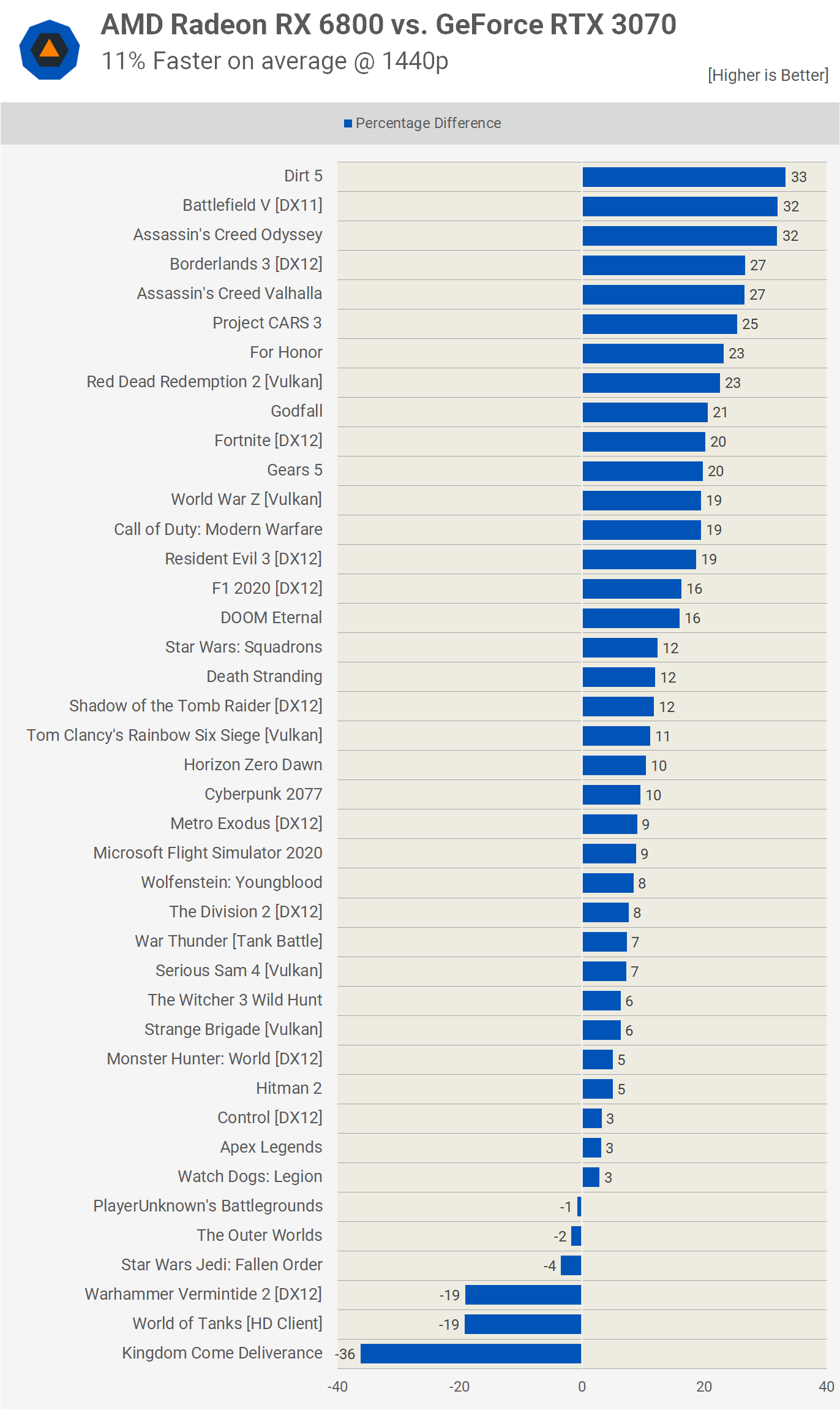 Starting with 1440p performance, we see that overall the RX 6800 is just 11% faster on average which is slightly lower than the 14% win it enjoyed in our day one review featuring 18 games. Of course, that review didn't include titles such as Kingdom Come Deliverance, World of Tanks, Warhammer Vermintide 2 and Star Wars Jedi Fallen Order.