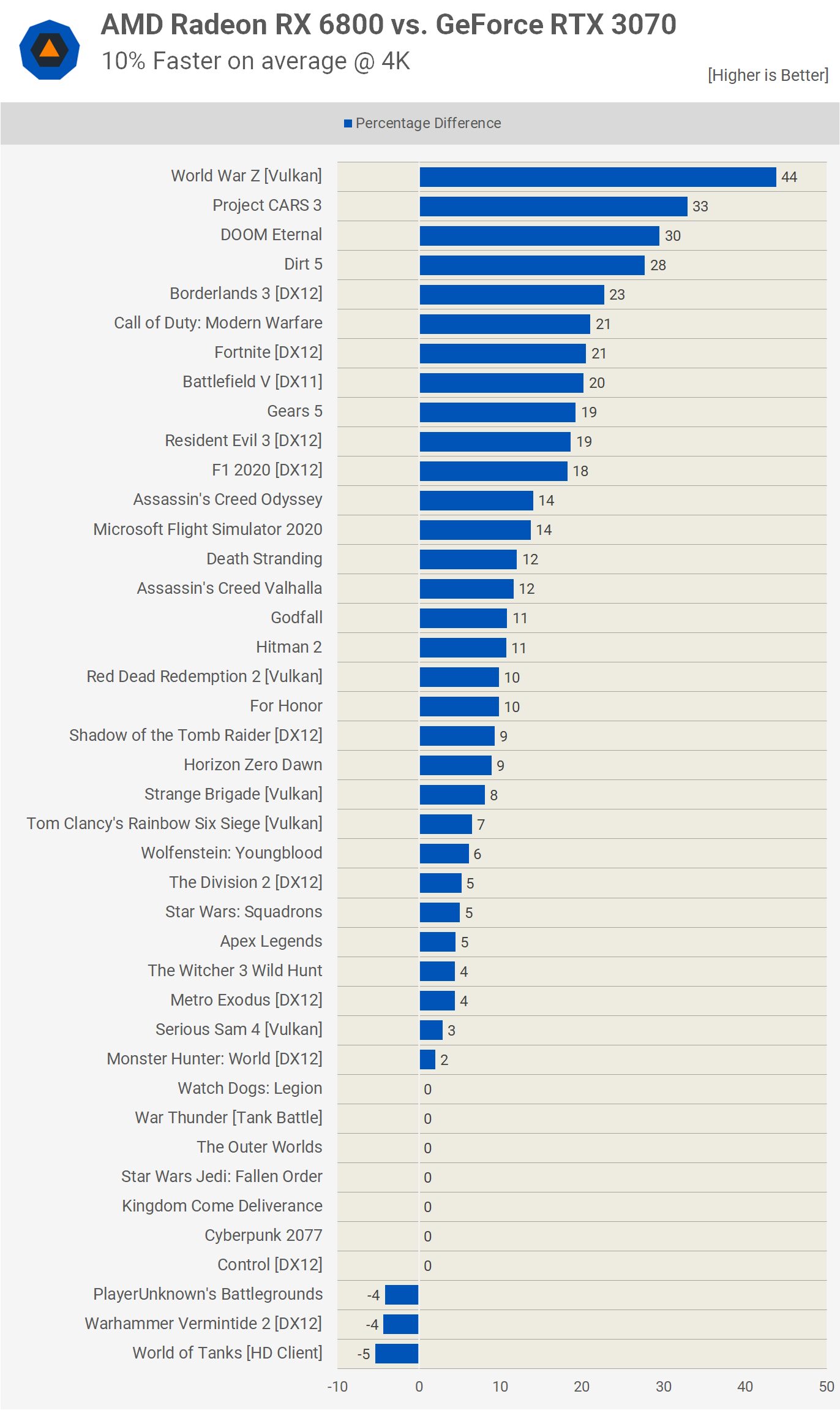 Games where the RX 6800 performs exceptionally well includes Dirt 5, Battlefield V, Assassin's Creed Odyssey, Borderlands 3, Assassin's Creed Valhalla, Project Cars 3 and about half a dozen or so more titles.