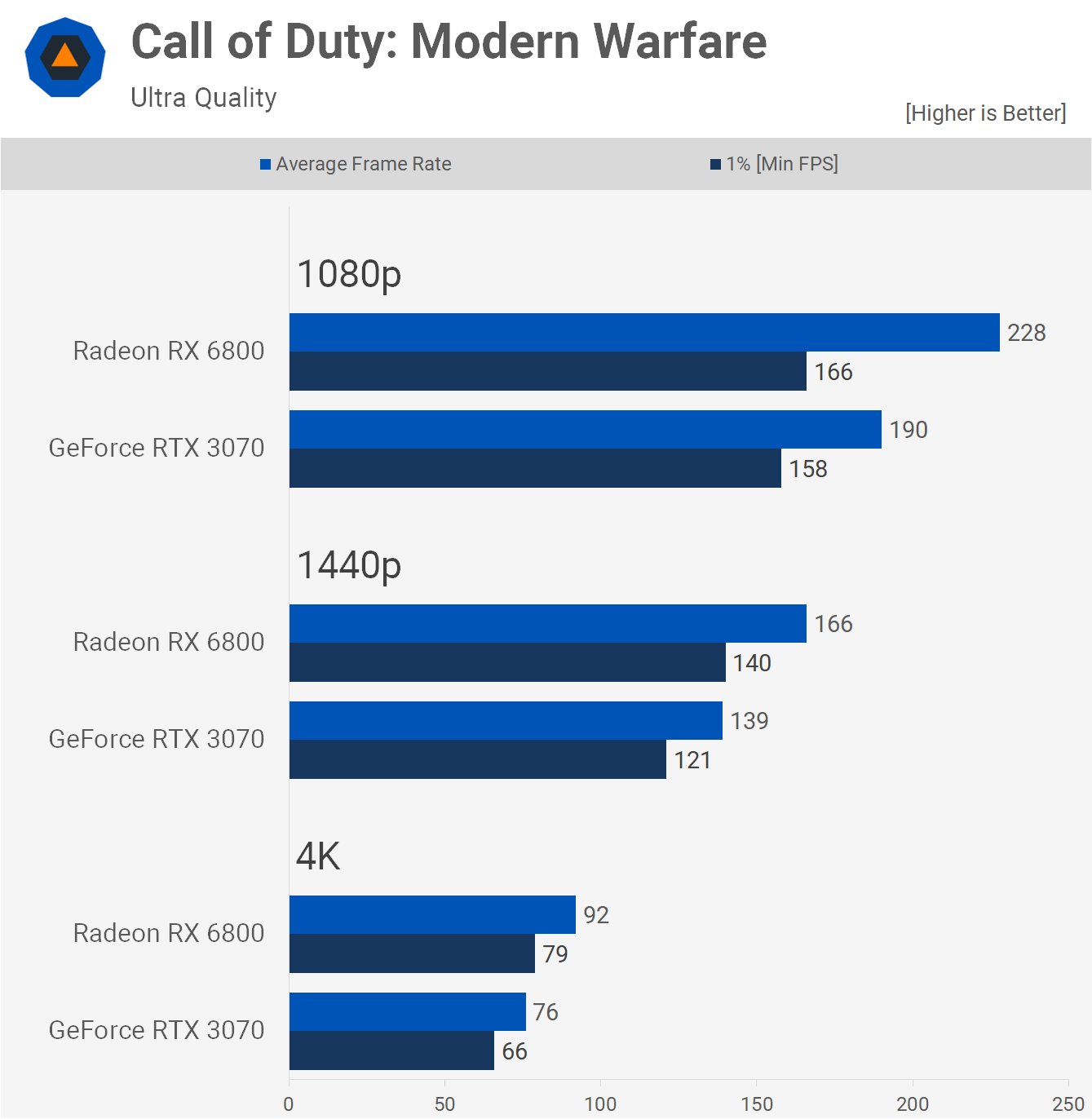 Call of Duty Modern Warfare appears to show a strong performance uplift for the RX 6800 over the RTX 3070. Around a 20% performance boost at all three resolutions, meaning that scaling between these two GPUs is very consistent. With the RX 6800 costing ~16% more but delivering about 20% more performance, it's the better value here, though not by a meaningful margin.