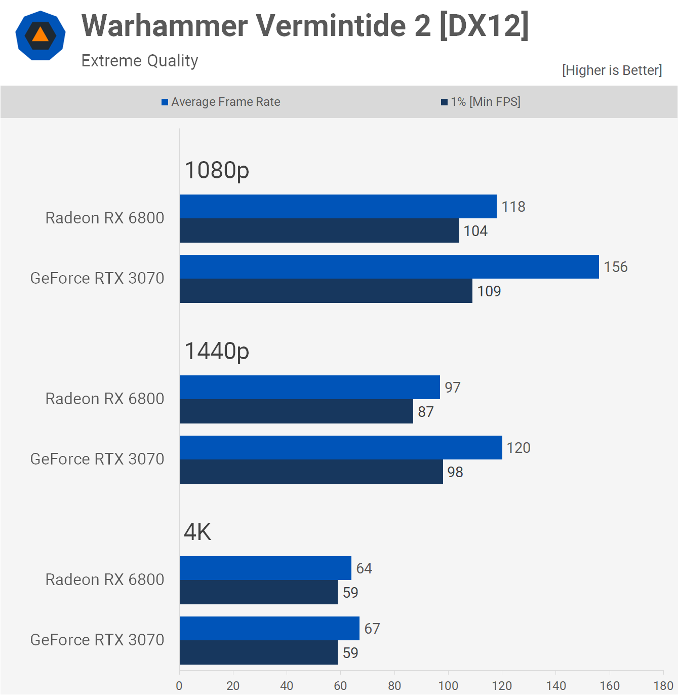 It wasn't all smooth sailing with the Radeon RX 6800, as we did run into a few titles where performance wasn't where you'd expect it to be, Warhammer Vermintide 2 being one such example. The game plays well and with over 100 fps at all times at 1080p, you could say performance was excellent. However, relative to the RTX 3070 it was kind of terrible, dropping behind the GeForce GPU by a 24% margin.