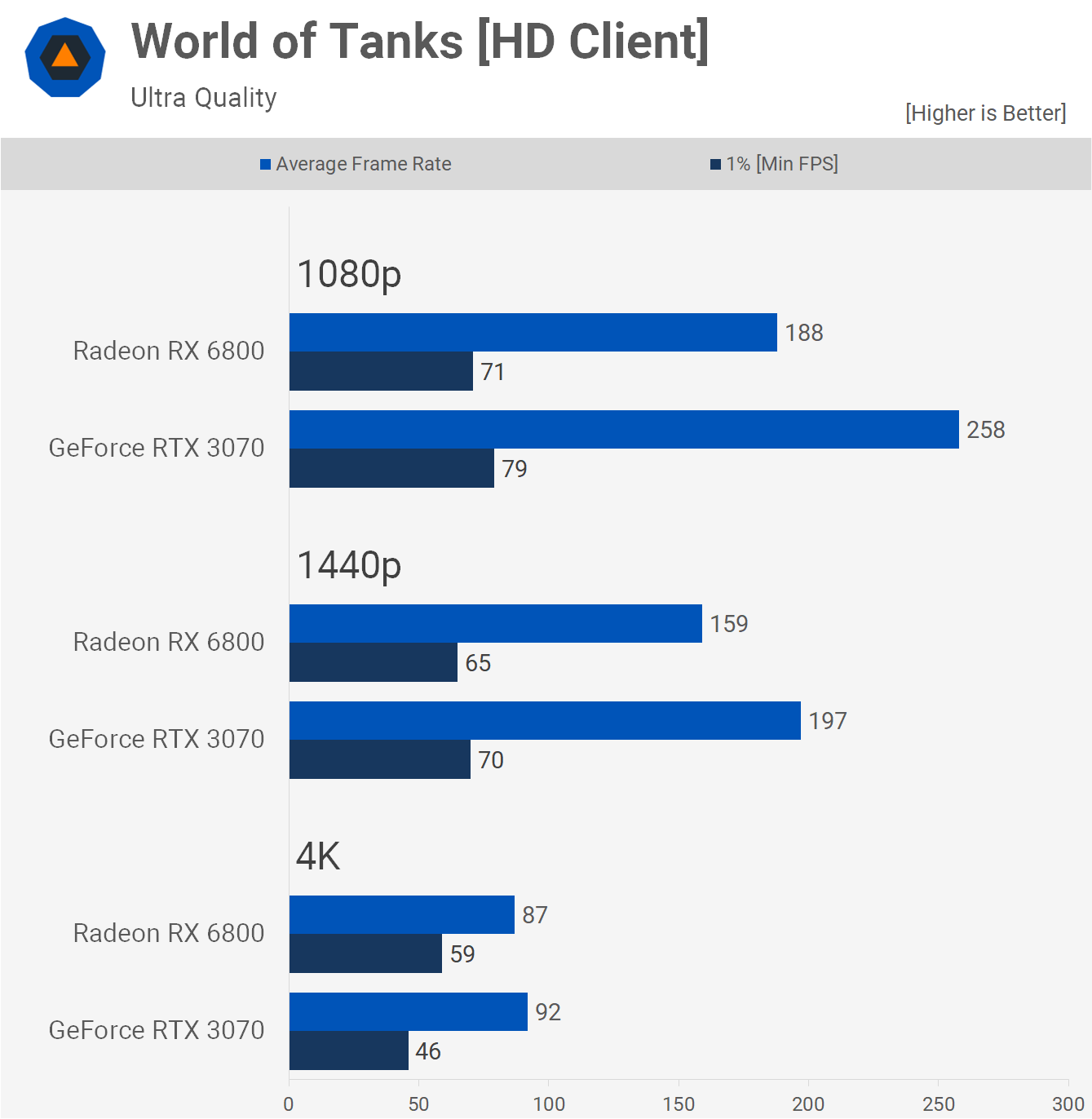 Another game that saw performance issues with the RX 6800 was World of Tanks. Overall performance is still good and well beyond what you'd need to take full advantage of when using a 144Hz monitor, but it was also well down on the RTX 3070 when looking at 1080p and 1440p performance.
